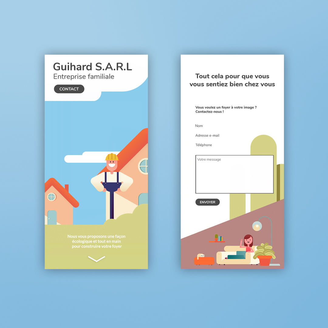 Nous avons imaginé le logotype, la charte graphique du site internet et les illustrations. Le logo est constitué de la lettre G qui entoure et protège le toit d'une maison. Les mascottes ont été réalisées en flat design, ainsi que l'ensemble des illustrations de la maquette du site web. Le tout s'harmonise dans un style familial et décontracté.