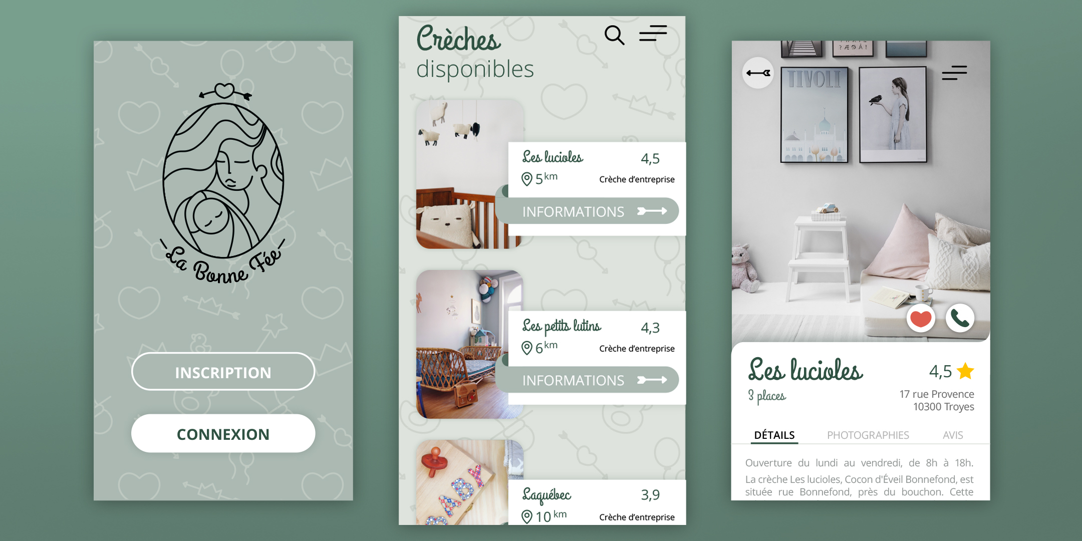 La Bonne Fée est une application qui permet aux parents de trouver la meilleure crèche pour leurs enfants. Après inscription, l'application donne accès à un annuaire sur lesquels les crèches sont classées selon les critères choisis : distance, type de crèche, nombres d'enfants accueillis, places disponibles, horaires d'ouverture... Un système d'évaluation intégré permet également aux parents de laisser une note et un commentaire sur la crèche de leur(s) enfant(s), ou de poser leurs questions à la communauté.