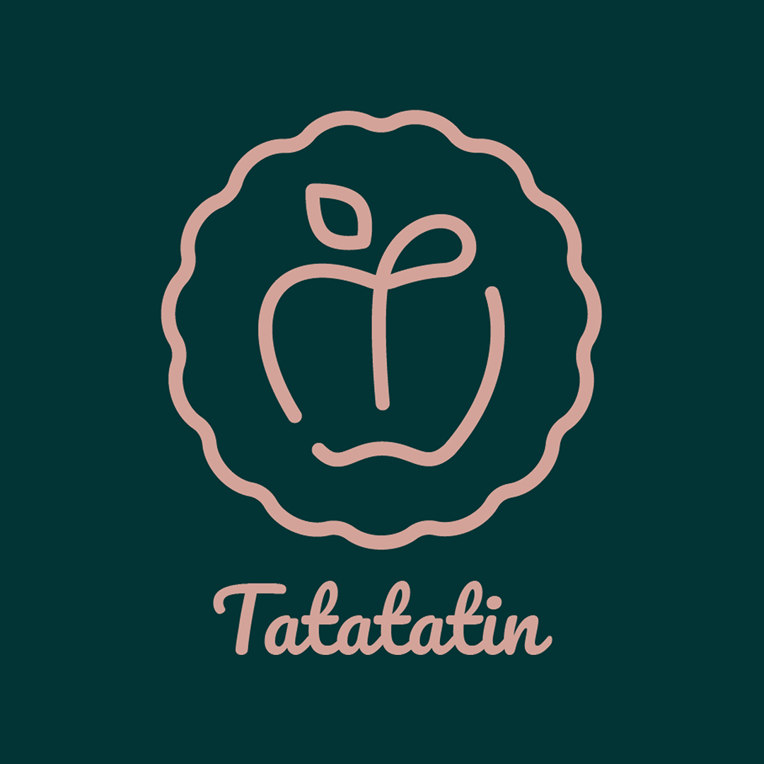 Le logo représente les contours d'un moule à tarte avec une pomme au milieu. Ses lignes très douces, associées à sa couleur vieux rose, lui confèrent un aspect à la fois authentique et moderne. Le menu et les cartes de visites sont sobres et élégants, et donnent envie de découvrir toutes les saveurs que Tatatatin a à offrir.
